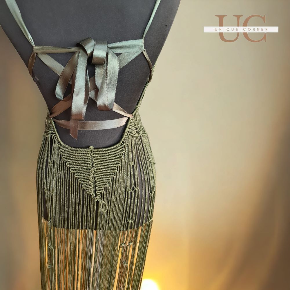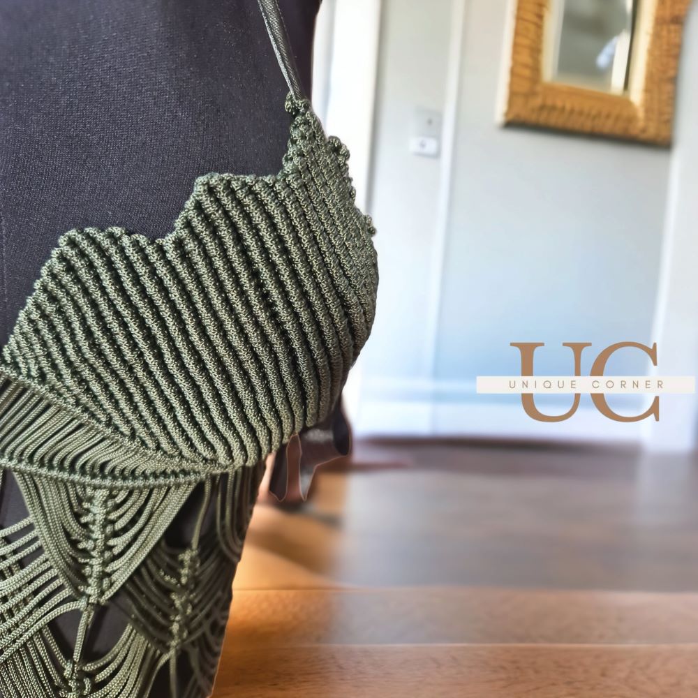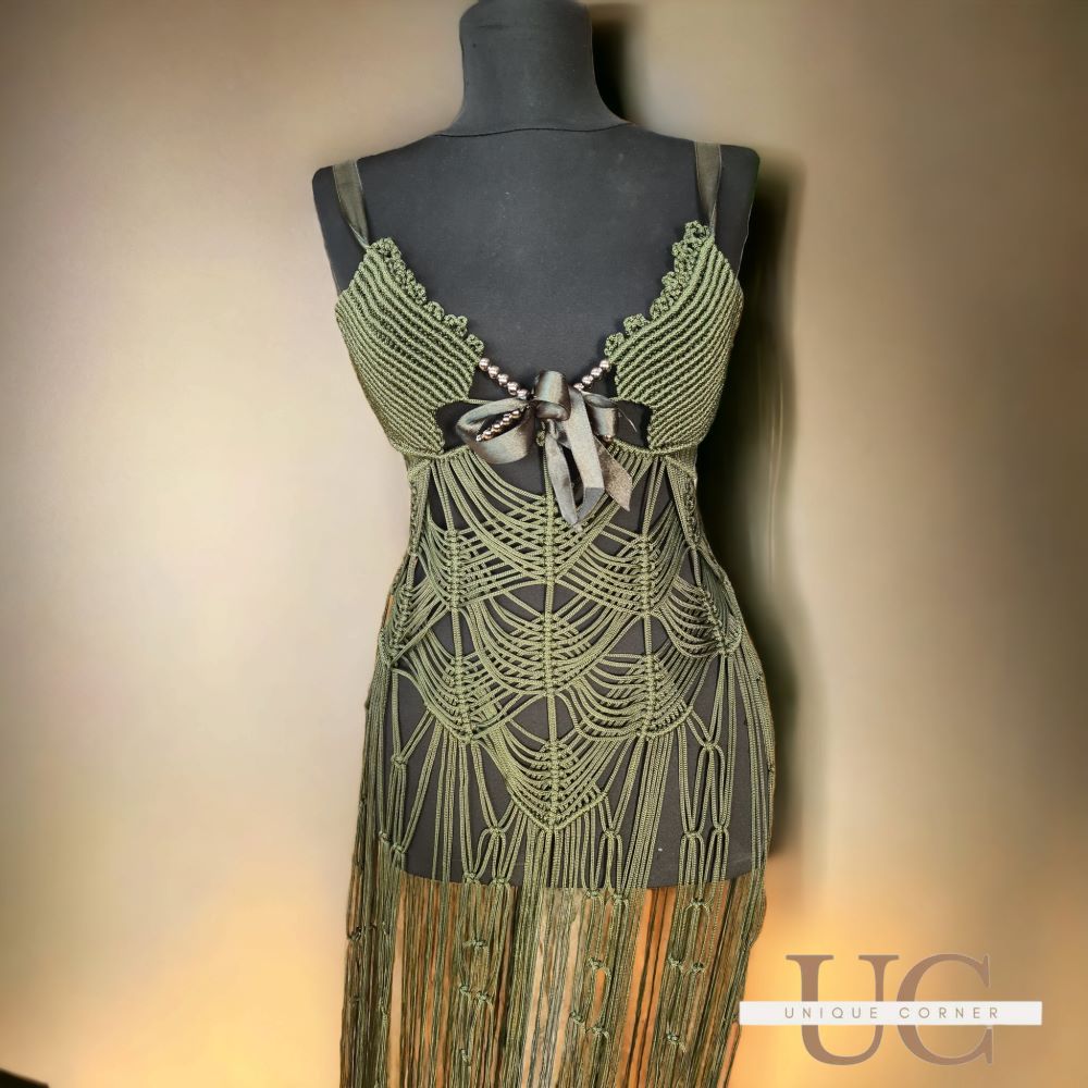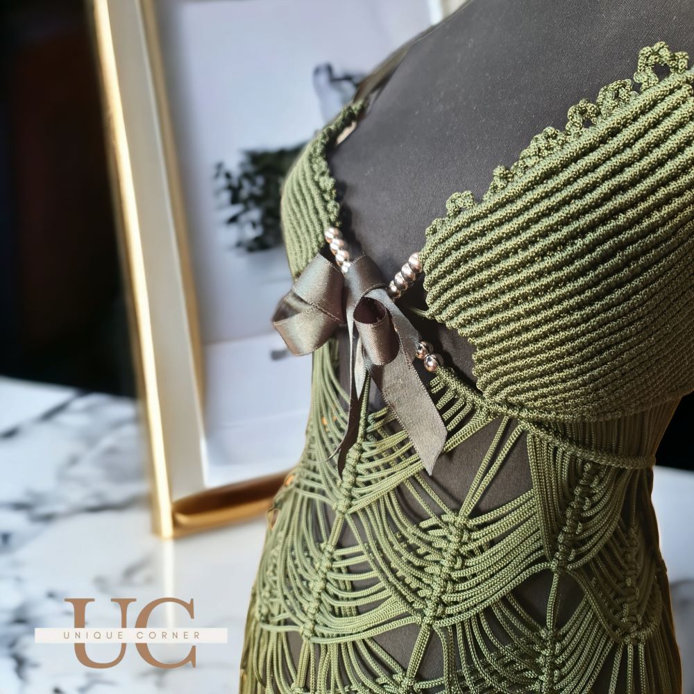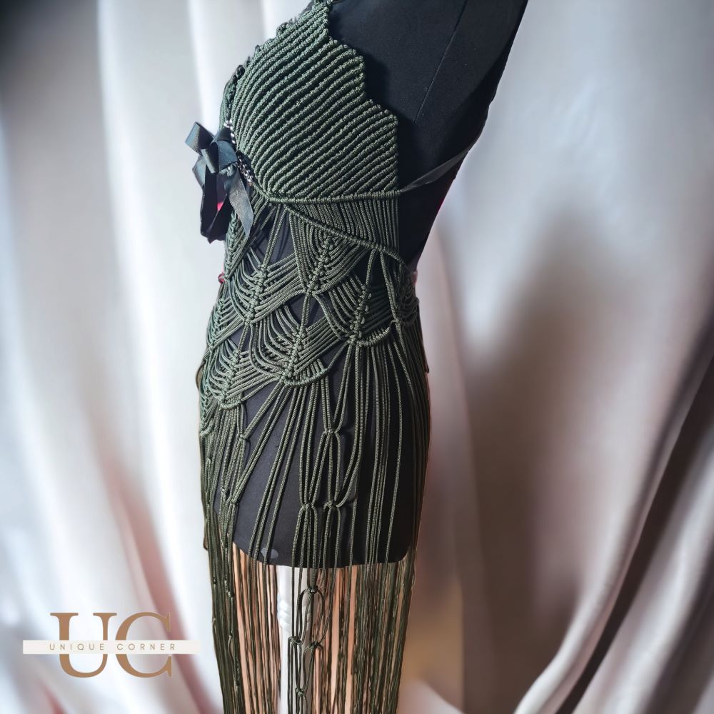 Екстравагантен модел на макраме фустан во темно зелена нијанса. Урбана варијанта која може да се комбинира на повеќе начини.