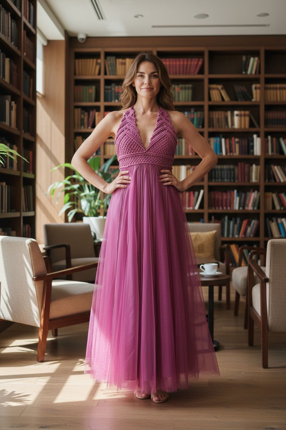 Преубава креација со пријатна нијанса на бургунди, изработена во макраме техника во комбинација со тул. Моделот одговара на повеке големини.