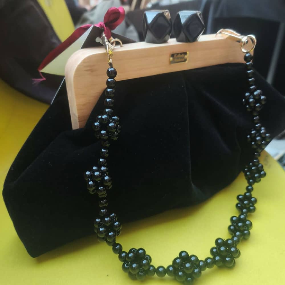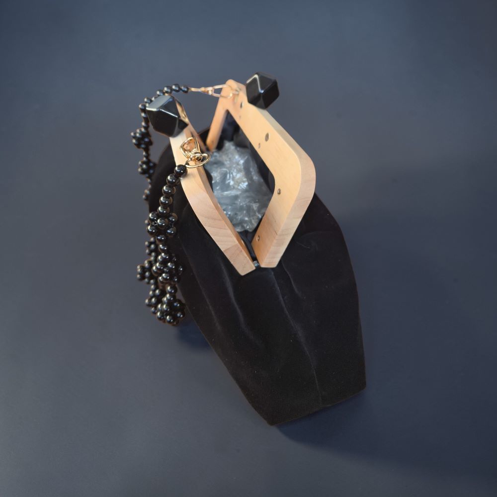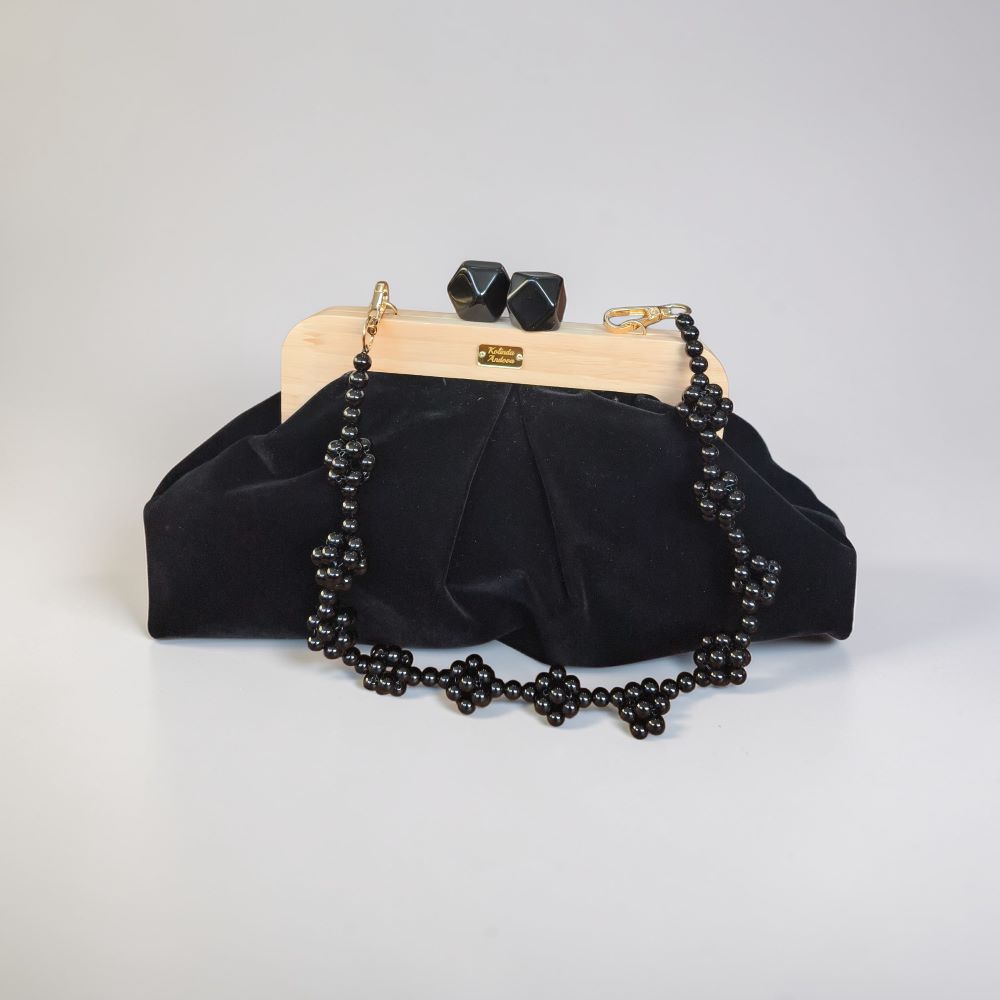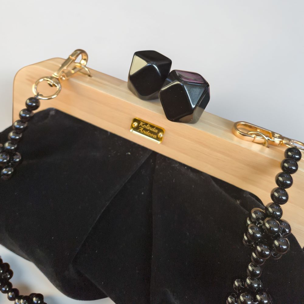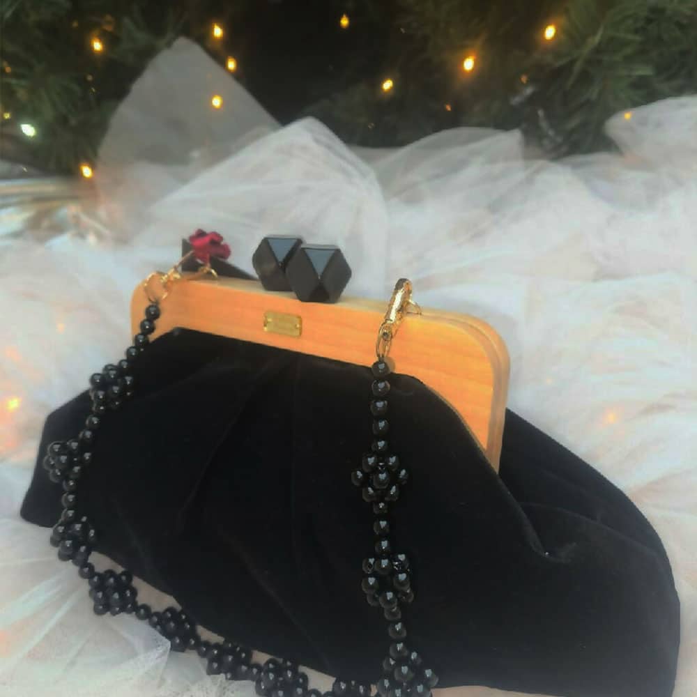Преубава комбинација на црн плиш и ретро затворање од полно дрво, со детали изработени од монистри.