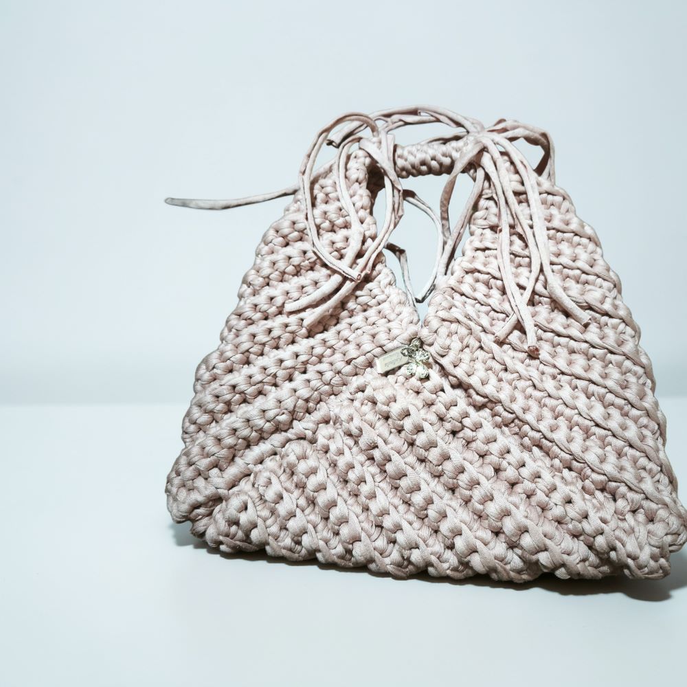 Секојдневен модел со несекојдневна форма изработен од трикотажен кабел во пудра боја.