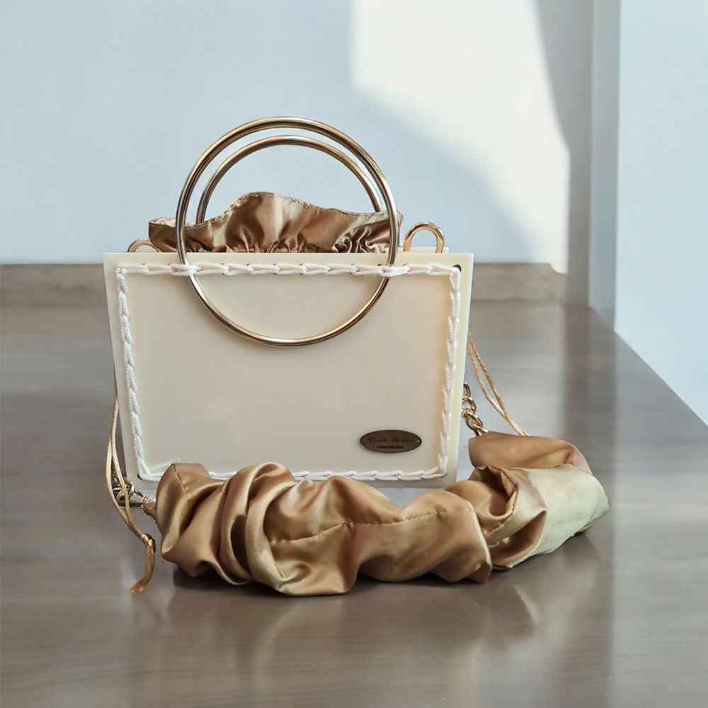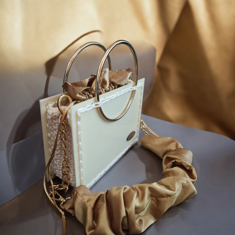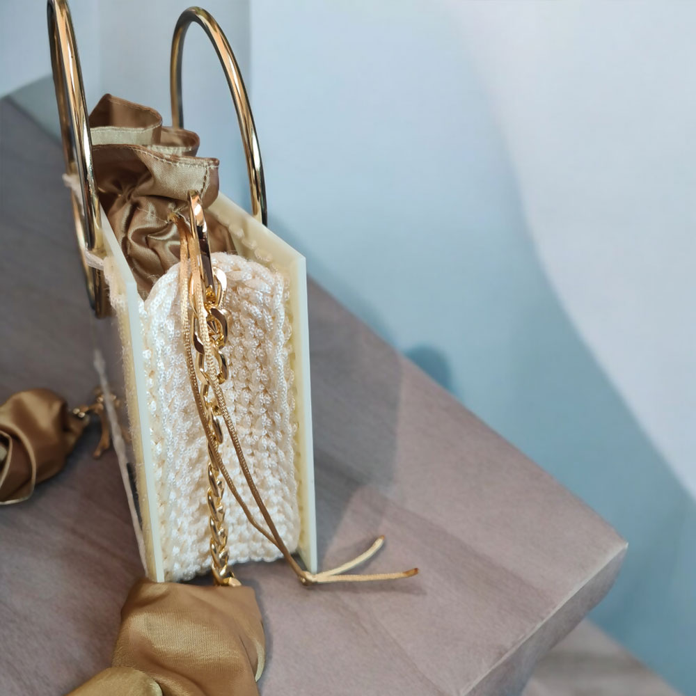 Ексклузивен модел дел од Брајдал колекцијата, изработен од плексиглас и макраме конец со златни додатоци во шампањ боја.