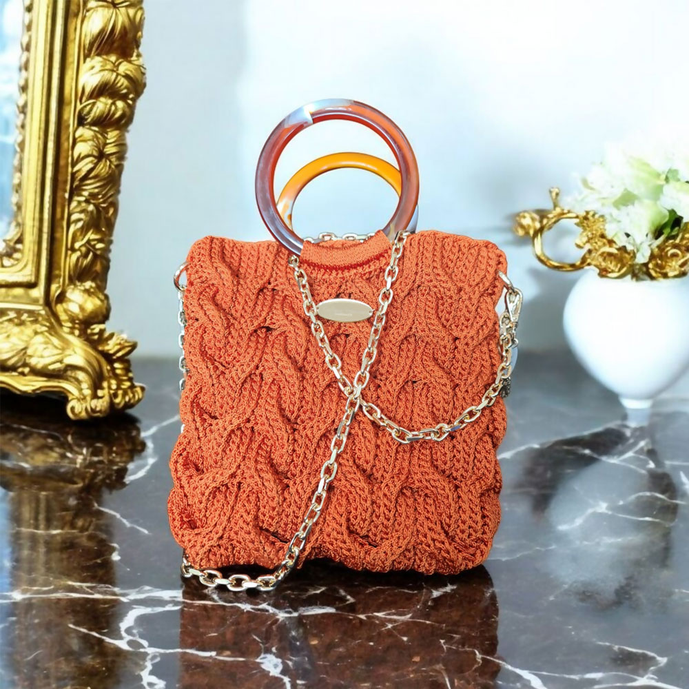 Елегантен модел изработен од макраме конец во предизвикувачка портокалова боја. Специфичен патерн на изработка златни додатоци, внатрешно поставување.
