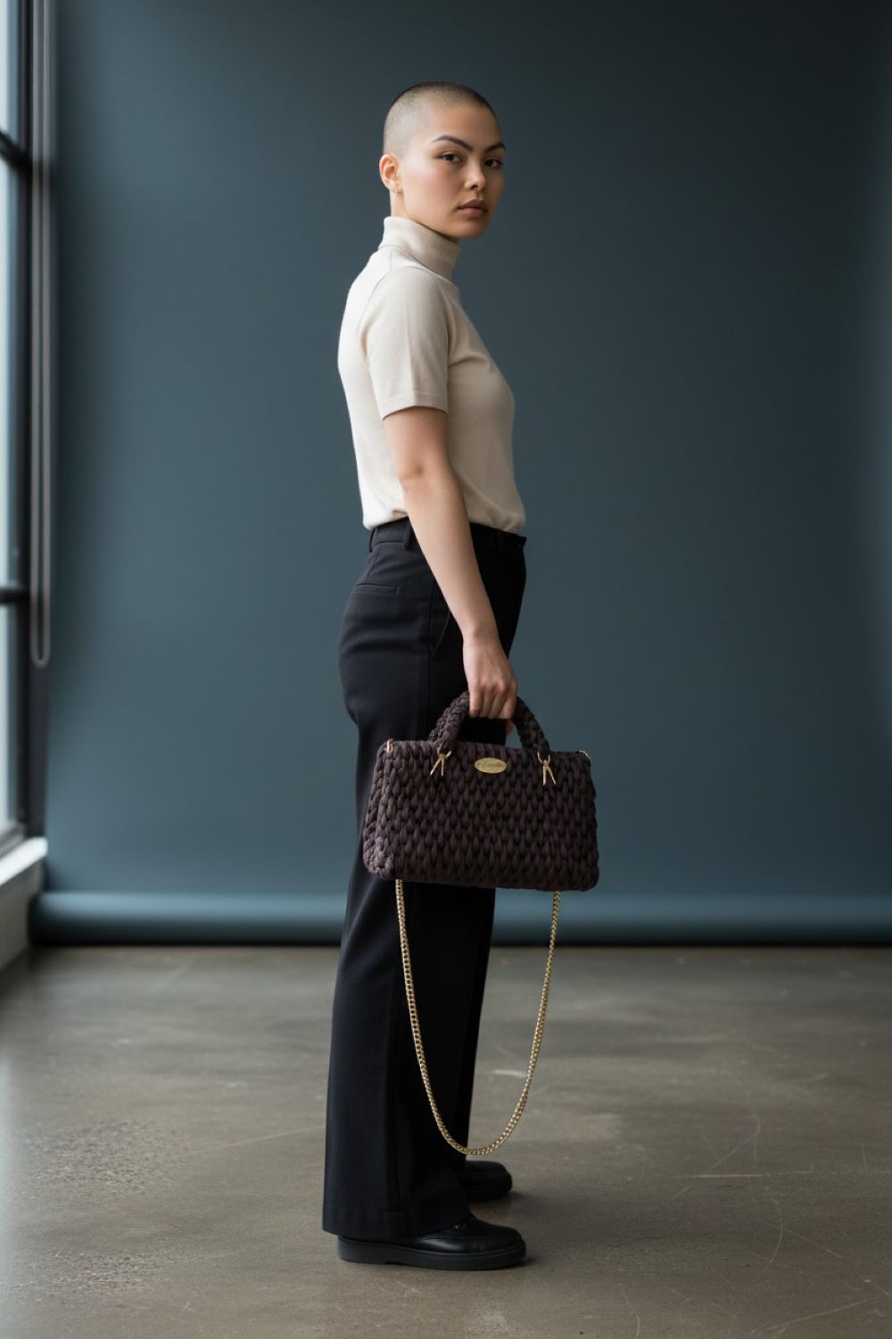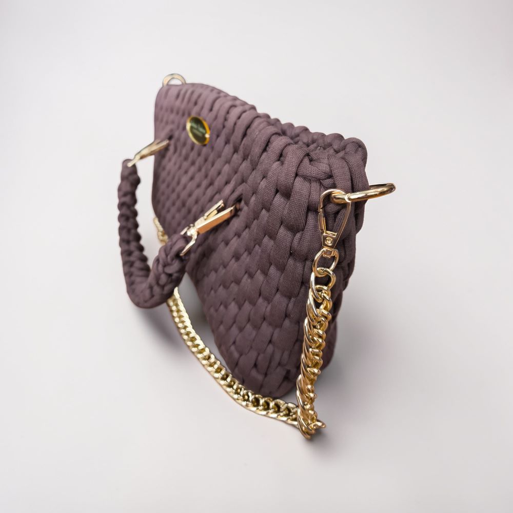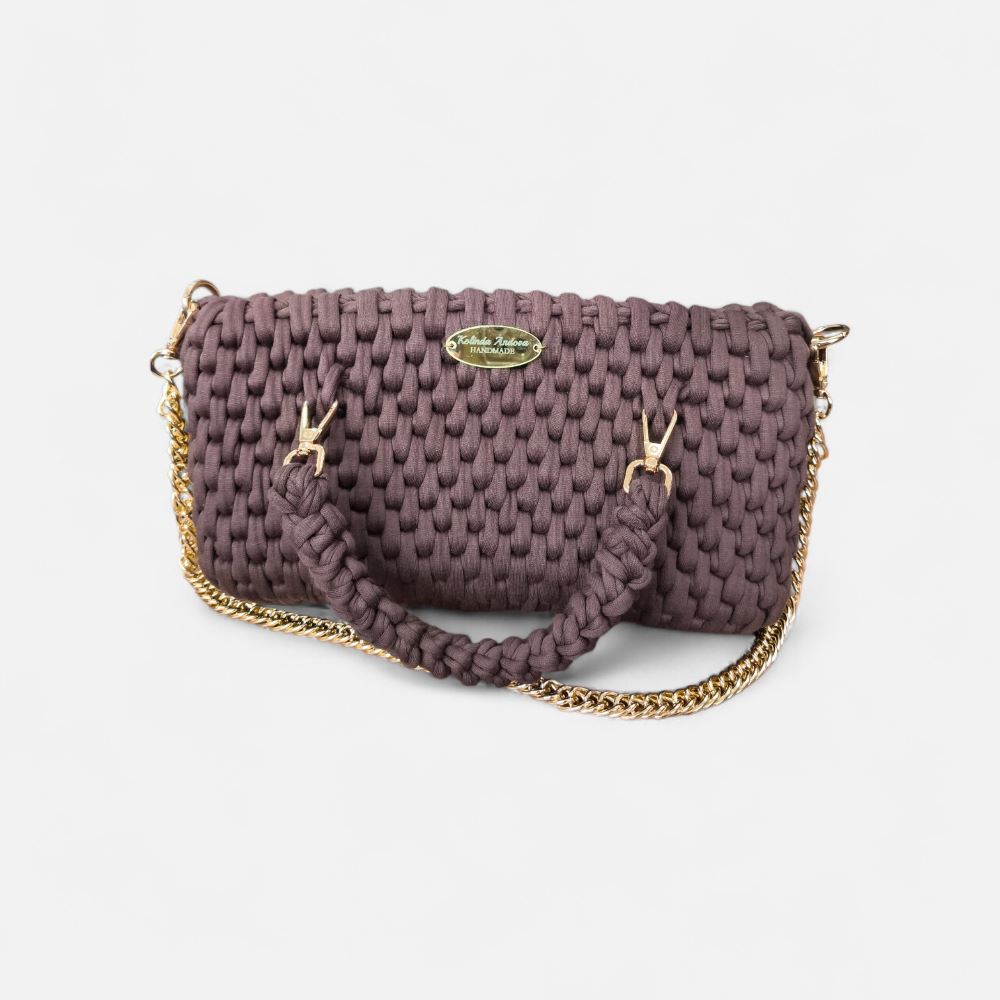 Бестселер модел овојпат изработен во чоколадна кафена нијанса со златни додатоци. Секојдневна работна варијанта изработена од трикотажен кабел.