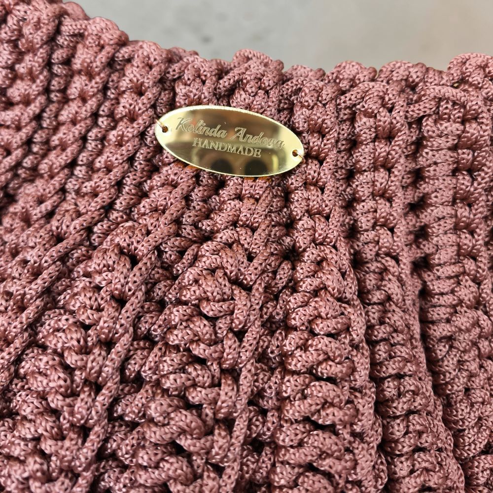 Модел израборен од богат синтетички макраме конец во нојанса на кафено со златни додатоци.