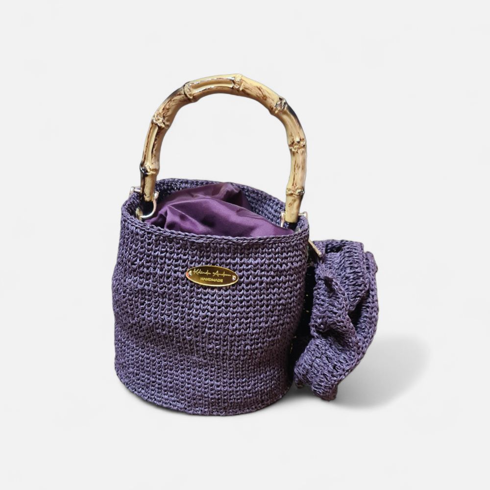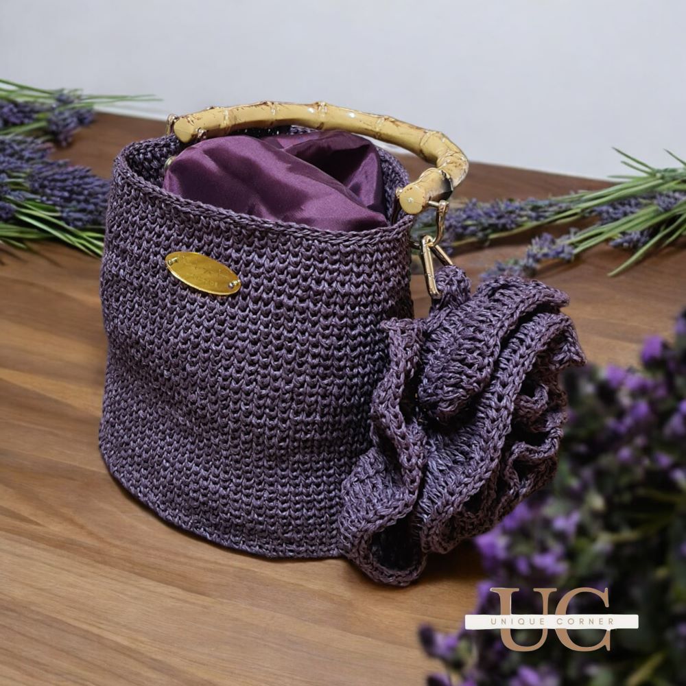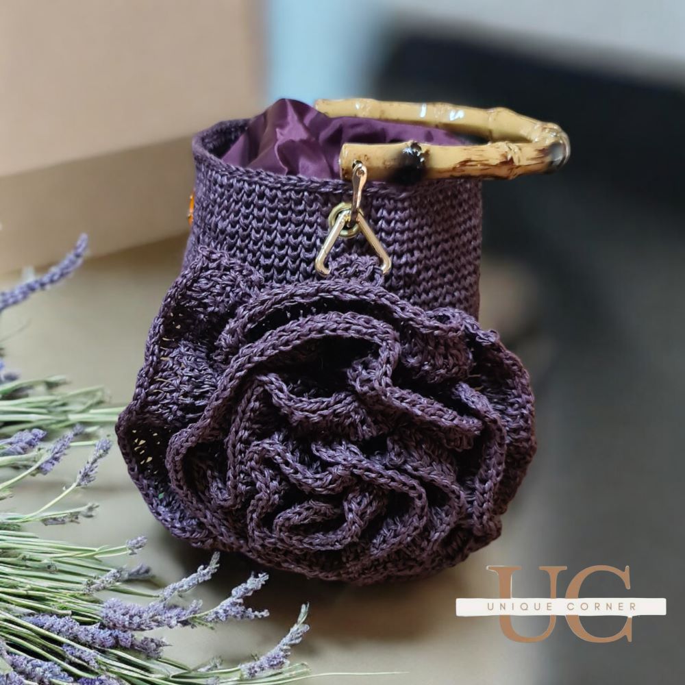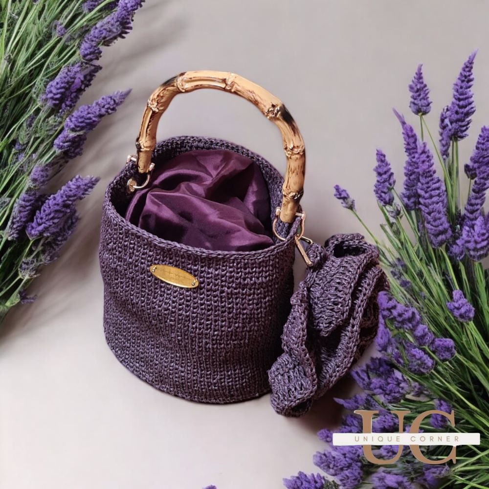 Урбана варијанта дел од колекцијата пролет лето. Моделот е изработен од рафија конец во моќна темно лила нијанса, со златни додатоци, уникатно надополнување на вашата тоалета во летните денови.